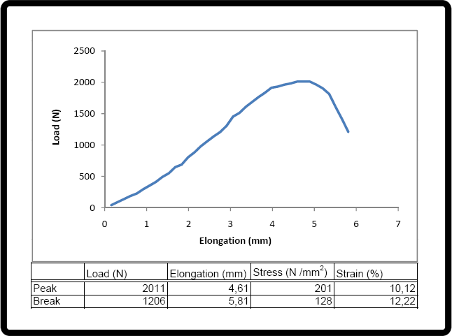 I provdragningsutrustningen kan vi belasta applikationer med en last upp till 10kN. Med ett mycket flexibelt inspänningssystem kan vi enkelt applicera provkroppen i provdragaren och få fram ett aktuellt brottvärde.